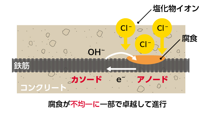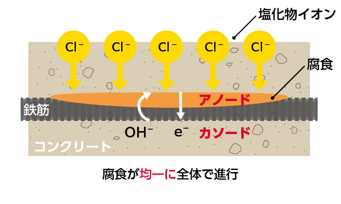 しかしながら、コンクリート中に塩化物イオンが浸入すると不動態皮膜が破壊され、腐食が始まる。コンクリート中の塩化物イオンの鋼材腐食発生限界濃度は不動態皮膜が破壊される塩化物イオン濃度であり、コンクリートの使用材料や配合、含水状態等に影響されるが、コンクリート体積あたりの質量で1.2〜2.5㎏/m³程度の範囲にあるとされている。