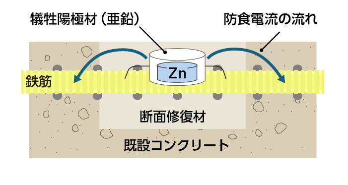 この考え方に基づき、マクロセル腐食対策として【図4】に示す電位差を強制的に下げる手法がある。この方法はカソード部の断面修復部の鉄筋に犠牲陽極材を設置し、これからアノード部の腐食した鉄筋方向に電流を流すことにより電位差をなくし、腐食をくい止める方法である3)。