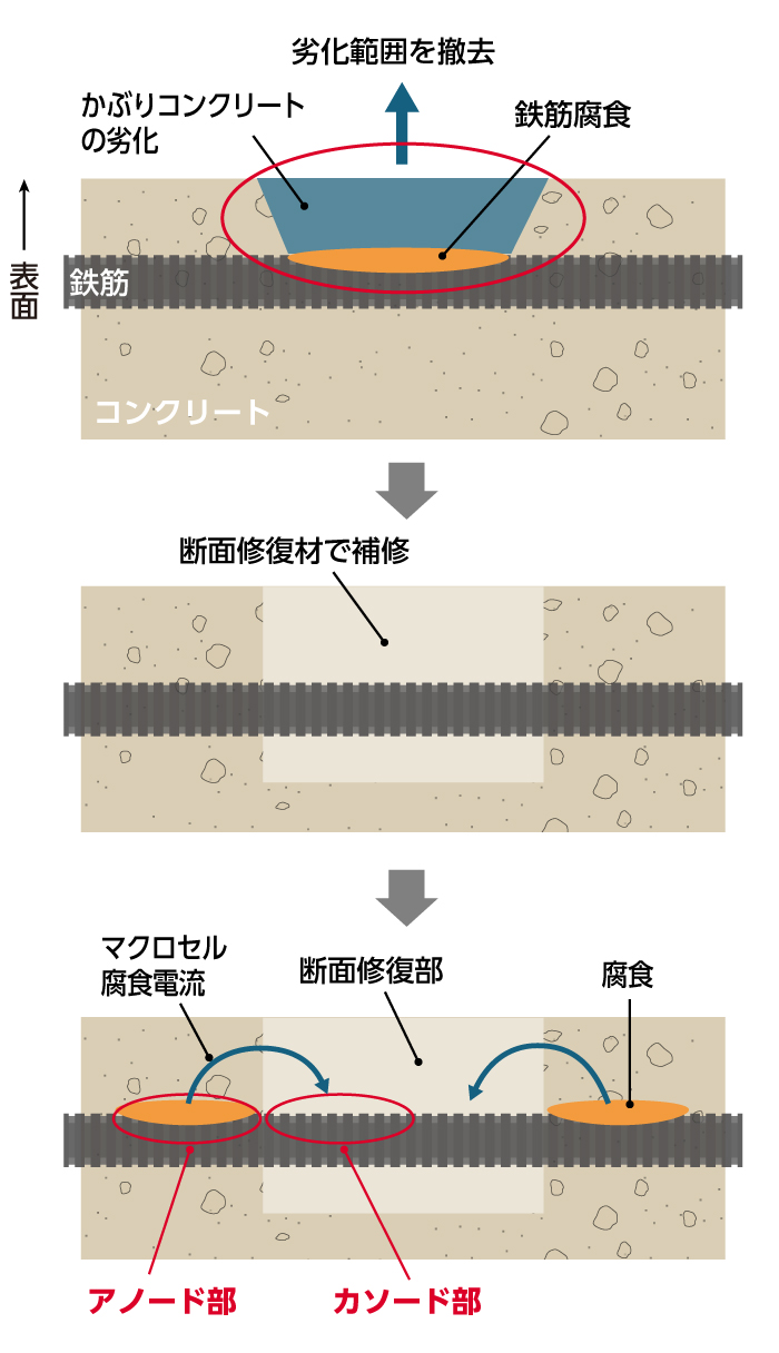 したがって、断面修復においてマクロセル腐食による再劣化を防止するには、既設部の鉄筋位置の塩化物イオン濃度が鋼材腐食発生限界濃度を超過しない段階で対策を実施する必要がある。また、断面修復した後に表面被覆工法や表面含浸工法を実施して劣化因子の浸入を防止することが有効である。