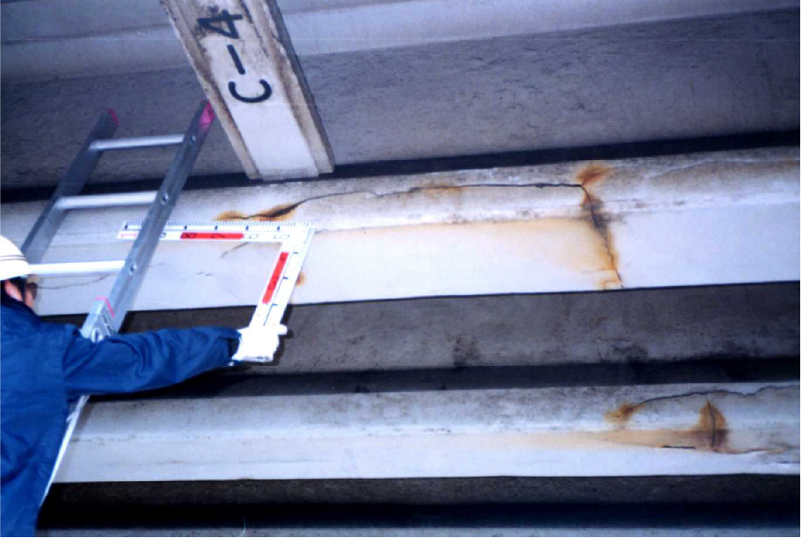 【写真1】は塩害環境下にあるPC桁に発生した再劣化の事例であり、過去の断面修復箇所と既設部との境界からさび汁が滲出している。このような損傷は塩害対策後の再劣化現象に多く見られる。