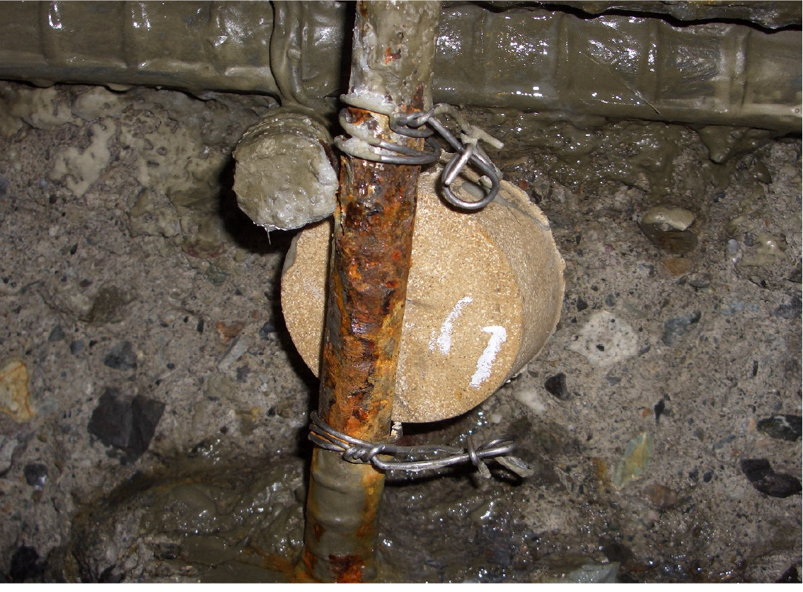 【写真2】はこの対策の事例であり、犠牲陽極材に亜鉛を用いたものである。鉄筋に亜鉛を結束させ、鉄筋の代わりに亜鉛を腐食させて、アノード部の鉄筋の腐食を抑制させるものである。この方法は電気防食工法の流電陽極方式のひとつで、腐食により亜鉛量が減少し効果が低下した時点で陽極材を交換する必要があり、腐食の抑制効果の確認方法や犠牲陽極材の交換方法などに課題もある。