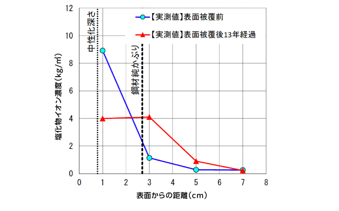 表面被覆後の浸入していた塩化物イオンの拡散状況
